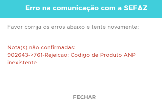 Nota(s) não confirmadas: 902643->761-Rejeicao: Codigo de Produto ANP inexistente [nItem:1]