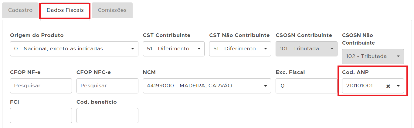 Após efetuar o download da tabela, abra seu cadastro de estoque - aba dados fiscais e confira o campo código ANP;