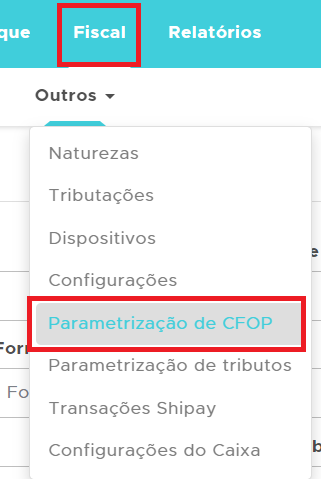 Para cadastrar a conversão de CFOP, acesse Fiscal e clique em Parametrização de CFOP: