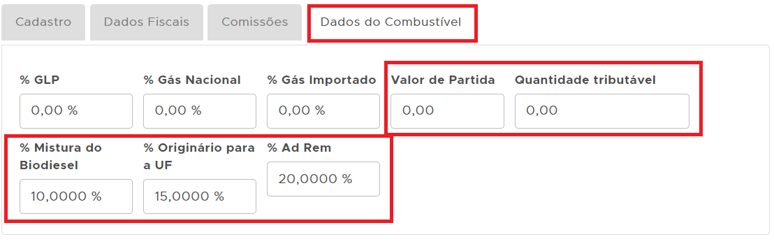 5. Clique na aba Dados do combustível, preencha os campos com as informações repassadas pela sua contabilidade nos campos destacados abaixo.