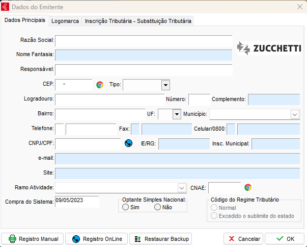 Após preencher todos os dados do Emitente, clique em OK para gravar as informações, em seguida acesse o novamente o menu Configurações > Emitente e clique no botão Registro Manual.