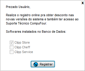 Caso a empresa possuir o Clipp Service ou Clipp Cheff instalado no computador será apresentada a opção para registrar o mesmo, mantenha marcada a opção correspondente ao Módulo Complementar utilizado e clique em Registrar.