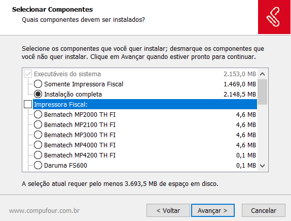 Em seguida escolha quais componentes serão instalados e qual o modelo da Impressora Fiscal (caso utilizar).