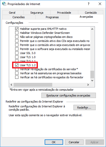 Clique na aba "Avançadas" e em seguida deixe marcada somente a opção: Usar TLS 1.2: