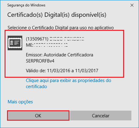 3. Serão apresentados os certificados disponíveis (deve existir apenas um, confira a validade);