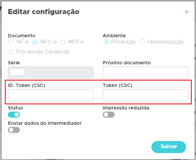 Na tela que abrir, encontre a configuração do ambiente do NFC-e, abra ela e preencha os campos ID. Token (CSC) e o Token (CSC), destacados abaixo conforme as informações coletadas com a SEFAZ ou com sua contabilidade.