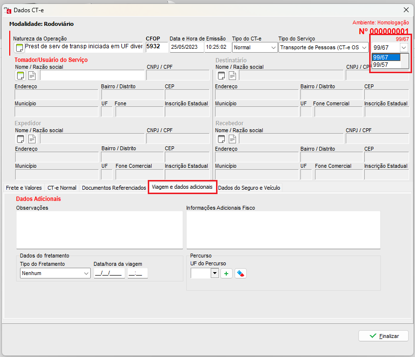 Para validar o tipo do serviço, o modelo selecionado deve ser o 67, caso contrario acusará erro. Quando selecionado o modelo 67, na parte inferior da nota, você irá encontrar uma nova aba (Viagem e dados adicionais) aonde você pode informar as Observações e Informações Adicionais ao Fisco.