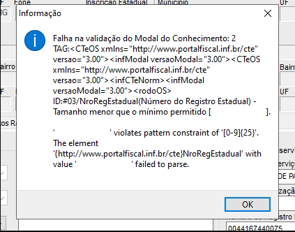 Para o campo Número do Retgistro Estadual, deve conter no mínimo 25 caracteres, caso não saiba qual preencher, deve ser preenchido com a IE (Inscrição Estadual) do emitente, composta de Zeros a esquerda até completar 25 caracteres, caso contrário, acusará a mensagem de erro se não for preenchido:
