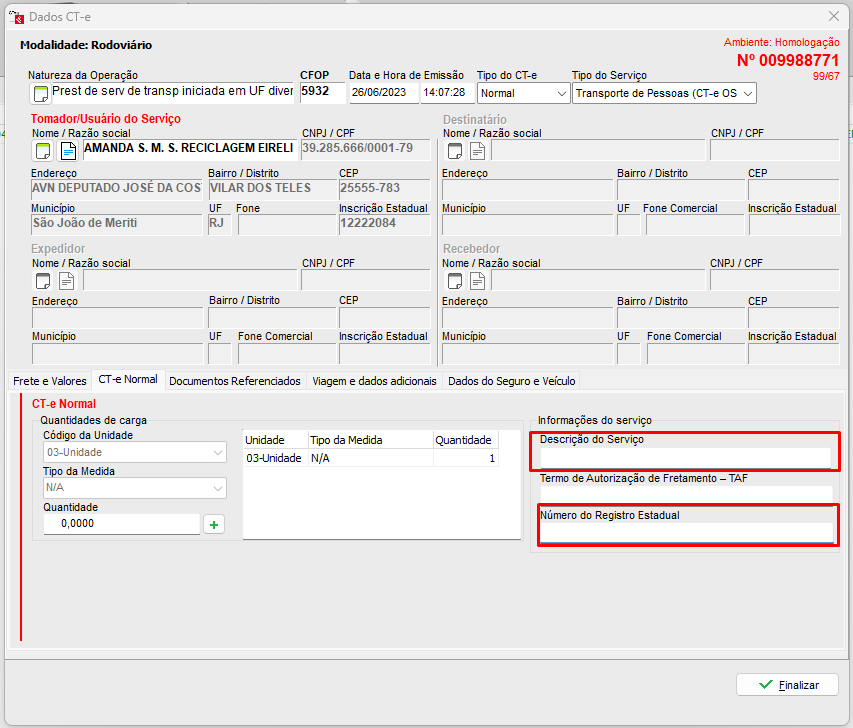 Após realizar todos os preenchimentos necessários, basta finalizar o CT-e OS.