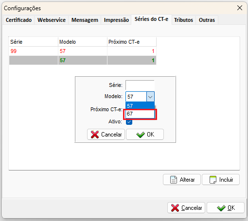 Vá até Configurações - aba Séries do CT-e - cliquei em incluir e selecione o modelo 67. Informe o número do primeiro CT-e OS, após isso clique em ok.