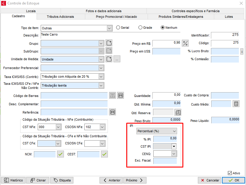 Com o cadastro aberto, no canto inferior direito da aba Cadastro, você encontrará um campo dedicado ao IPI.