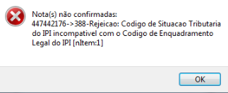 Rejeição 388 - Código de Situação Tributária do IPI incompatível com o Código de Enquadramento Legal do IPI