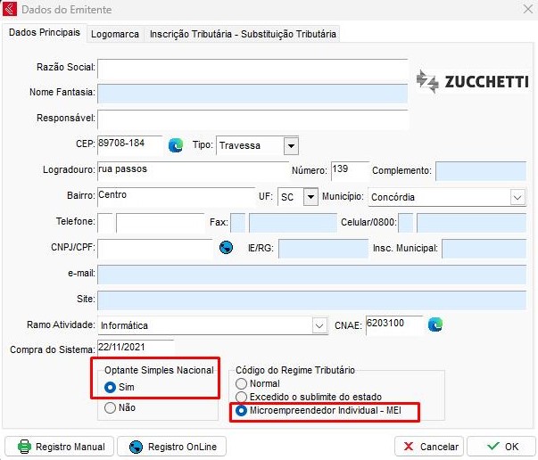 Na aba Dados Principais (além dos demais dados) efetue o preenchimento da Inscrição Estadual de sua Micro Empresa Individual e no campo Optante Simples Nacional marque em a opção "Sim" e no Código do Regime Tributário selecione a opção de Microempreendedor individual - MEI;