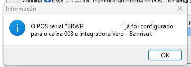 Importante: É um número de série por caixa, se desejar usar o mesmo número de série (POS) para outro Caixa mostra:
