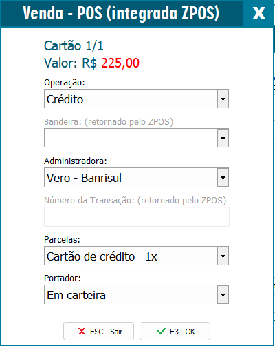 Clicando em F3 - OK, será enviado a solicitação para a maquininha POS: