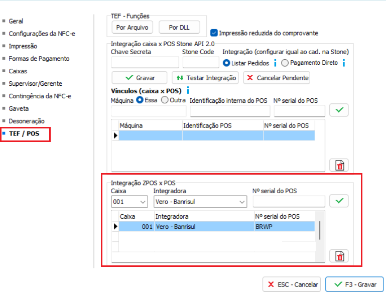 Abra o emissor de NFCe, pressione F10 - TEF / POS - Funções, em seguida, nela você encontrará também os campos para incluir a configuração do ZPOS conforme imagem abaixo: