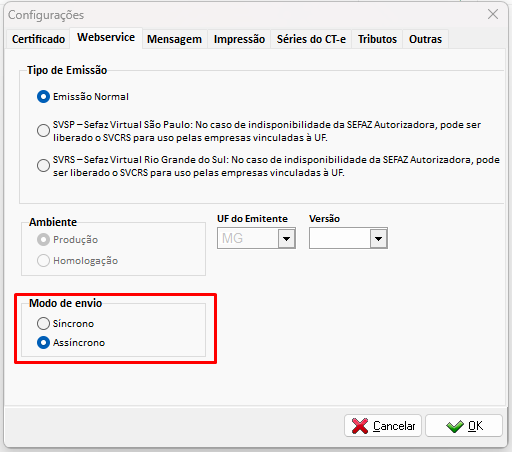 Abra a aba Webservice, marque o Modo de envio Assíncrono;