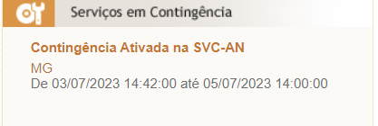 Atualmente o servidor da SEFAZ de MG está indisponível por questões de manutenção, a SEFAZ emitiu um comunicado que ativaria o ambiente de contingência até dia 05/07 às 14:00, conforme imagem abaixo: