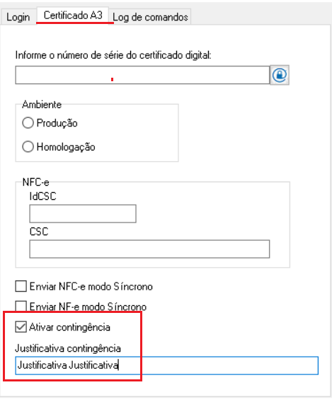Caso você utilize o certificado no Tipo A3, abra o integrador ClippFacil, clique na aba Certificado A3 e marque a opção Ativar Contingência, lembre-se também de preencher a contingência;