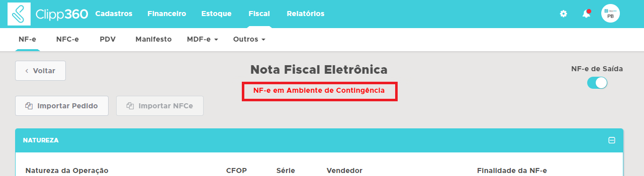 Após isso basta clicar em e abrir o módulo Fiscal - NF-e e emitir a nota em contingência. Ao Abrir a nota, você verá a informação que está ativo a emissão em contingência.