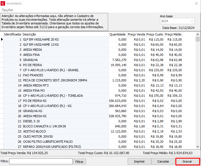 OBS: Caso há produtos com quantidade negativas, o valor desses produtos é subtraido no momento de edição da tabela de inventário, porém na geração do inventário é incluso somente produtos com quantidade superior a zero, portanto o valor na geração do inventário será maior do que o apresentado na tabela de inventário.