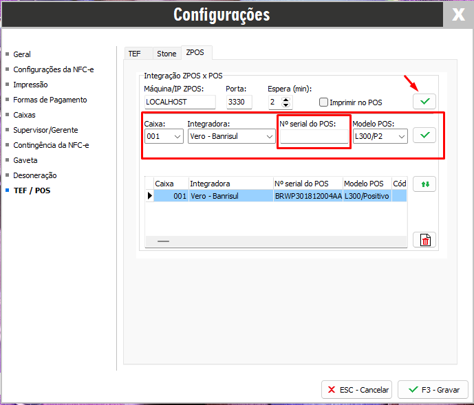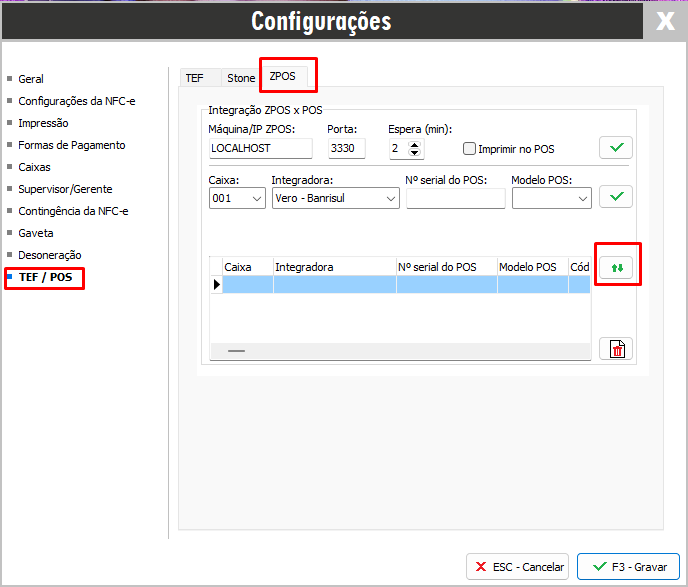 Também é necessário efetuar a instalação do Integrador Z-POS, vá até Configurações (F10) - TEF/POS - Aba ZPOS - clique no icone indicado na imagem a baixo;