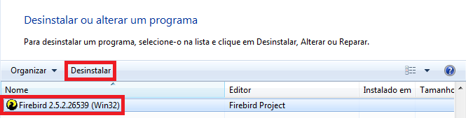 Na lista que for apresentada, localize o Firebird 2.5.2 e desinstale o mesmo;