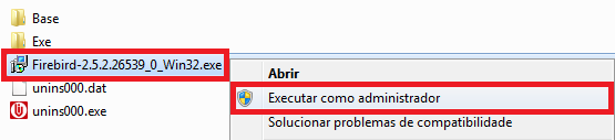Localize o arquivo Firebird-2.5.2.26539_0_Win32.exe ou somente Firebird-2.5.2.26539_0_Win32, clique com o botão direito sobre o mesmo e vá até Executar como Administrador;