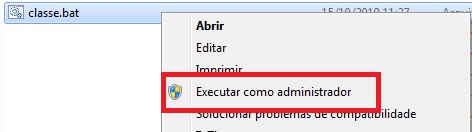 Localize o Classe.bat ou apenas Classe, clique com o botão direito no mesmo e em seguida Executar como Administrador;