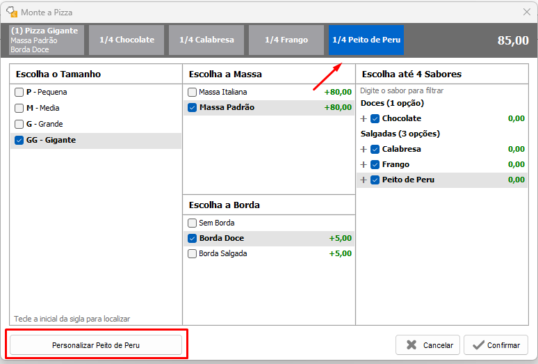 Caso queira personlizar algum sabor ou colocar uma observação na pizza, selecione o sabor ou a massa na parte superior e clique no botão Personlizar.