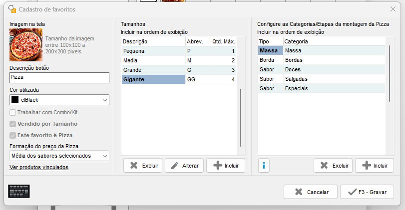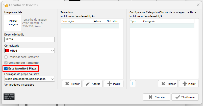 E para informar que este favorito é Pizza, marque a opção de Este favorito é Pizza, quando marcada essa opção, a opção de Vendido por Tamanho também será marcada.