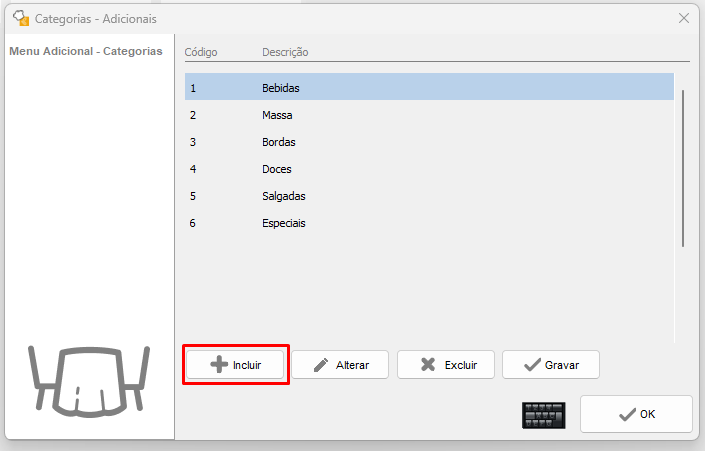 Clique no botão “Incluir”, preencha a descrição da categoria que deseja utilizar para as as massas das pizzas (Sugestão: Massas).