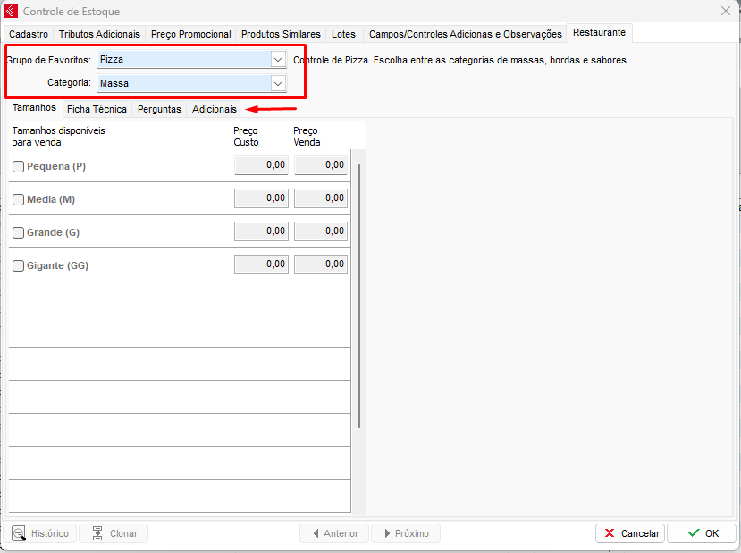 Na aba de Tamanho, selecione quais tamanhos essa massa está disponível para venda e também pode ser informado o Preço de Custo para aquele tamanho.
