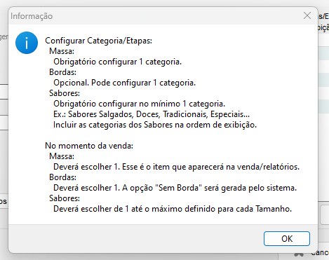 Então preencha a quantidade de sabores referente ao tamanho da pizza, determinando os tamanhos e quantias de sabores, clique em OK.
