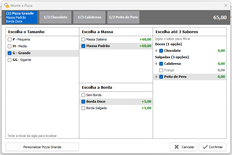 Após concluir a montagem da pizza, clique no botão Confirmar e a pizza será lançada na mesa, comanda, pedido ou venda rápida.