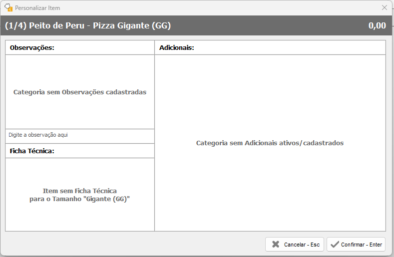 Clicando em Personaliza... abrirá uma tela com a opção de colocar Observações, caso tenha Adicionais apresentará nessa tela e também a opção da Ficha Técnica.