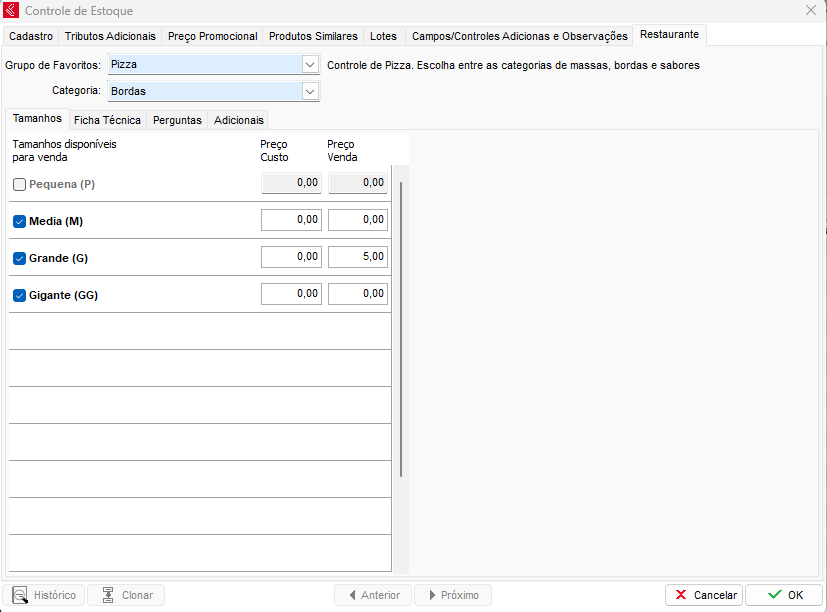 Na aba de Tamanhos, ative os tamanhos que essa borda estará disponível, e se caso a borda terá um valor adicional na pizza, informe no campo de Preço Venda.