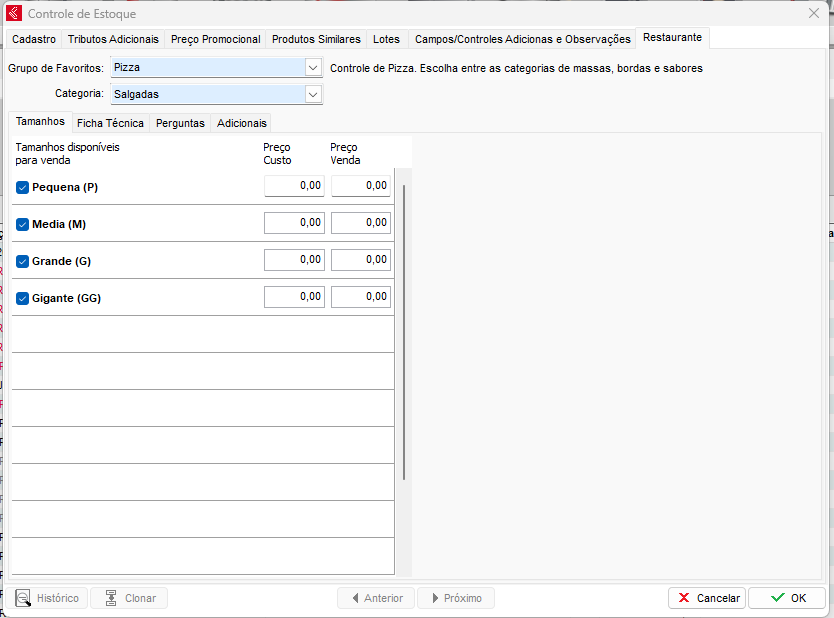 Temos também a opção do Preço de Venda, onde pode ser informado o preço base da pizza, ou já informar o preço final da que ela será vendida.