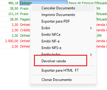 Clique com o botão contrário do mouse sobre o documento que está sendo devolvido e localize a opção Devolver Venda, clicando sobre ela será aberta a janela para selecionar os itens que deseja devolver.