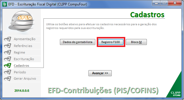 Para lançamento de dados no registro F100 no Clipp, abra o gerador do arquivo, que está dentro da pasta EXE onde o sistema está instalado com o nome de Sped_PIS_COFINS. Todas as opções a serem selecionadas na geração do arquivo devem ser informadas pela contabilidade da empresa. Abrindo o gerador, aparecerá a Apresentação do EFD Contribuições, então clique em Avançar, selecione as opções referentes à Referências, Regime, Escrituração, na etapa de Cadastro, existe um botão com o nome "Registro F100", para criar o registro clique sobre a opção (conforme figura 01);