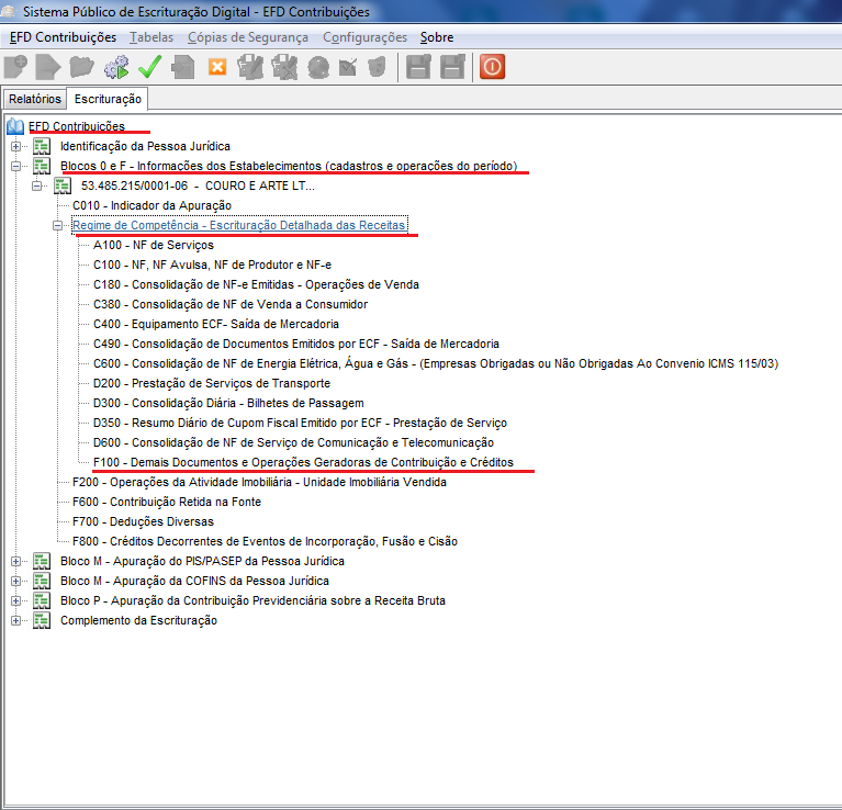 Para localizar esse registro dentro do validador do SPED, acesse Escrituração / EFD Contribuições / Informações dos Estabelecimentos / Selecione o estabelecimento / então agora poderá selecionar tanto entradas como saídas e após isso "Demais Documentos e Operações Geradoras de Contribuição e Créditos (F100)" (conforme figura 03);
