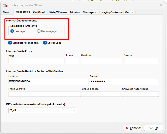 Após preencher essas informações, vá até a aba WebService, informe o ambiente para a emissão;