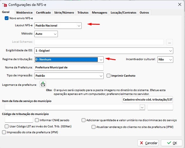 Abrindo o Emissor de NFS-e, clique em configurações - Na aba Geral informe o Layout da NFS-ePadrão Nacional - Regime de tributação informe 0- Nenhum