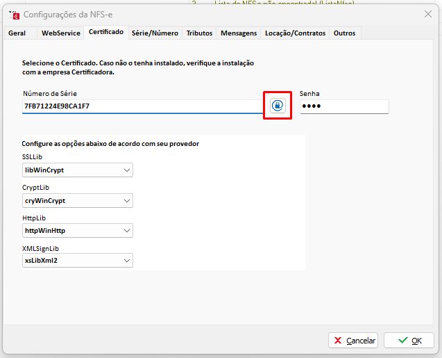 Na aba Certificado selecione seu certificado no botão destacado na imagem abaixo e informa a senha do mesmo ao lado;