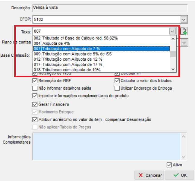 Primeiramente é necessário indicar no item algumas tributações, por exemplo o CST e a taxa ICMS/ISS, que é a alíquota correspondente ao cálculo. Abaixo são apenas exemplos, lembre-se de verificar com sua contabilidade os valores correspondentes;