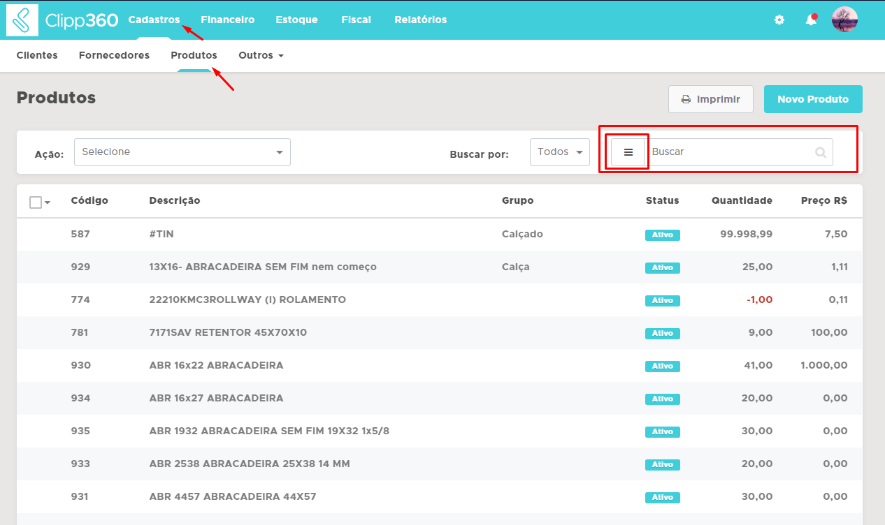 Acesse o módulo desejado, no caso desse exemplo, o módulo do Estoque (Cadastros - Produtos)