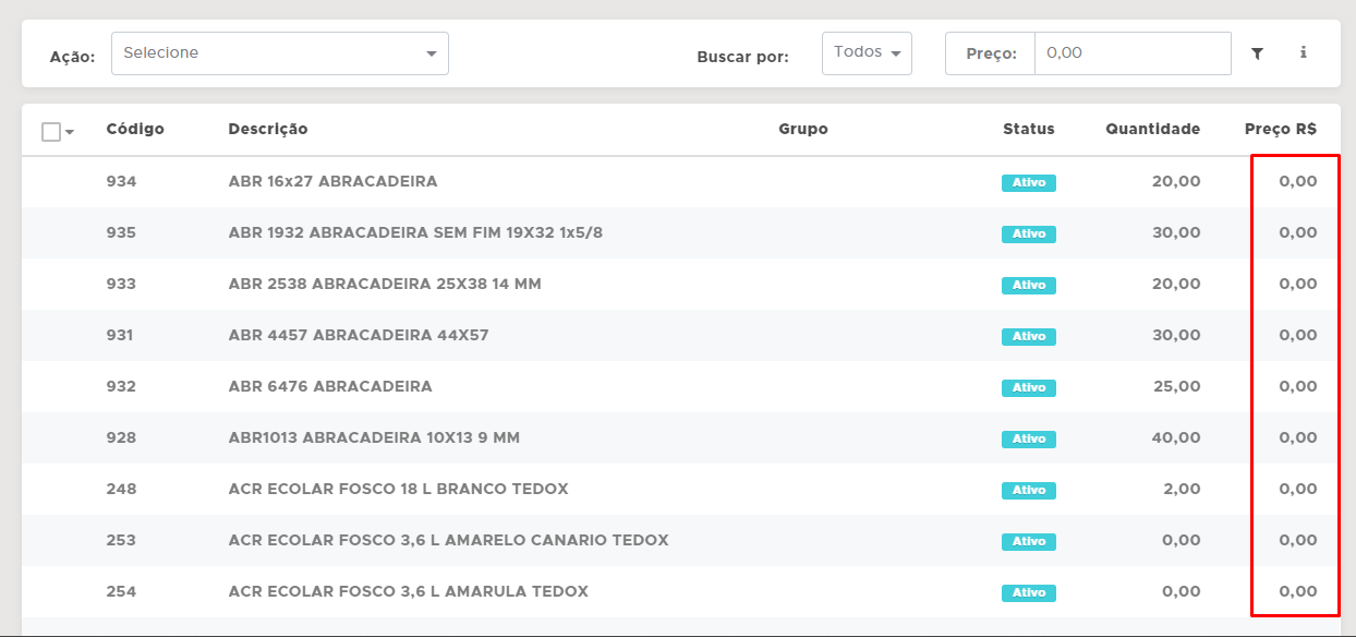 Assim todos os itens que contém o Preço R$0,00 no seu estoque, aparecerão filtrados na tela. O mesmo irá acontecer com qualquer outro campo que foi selecionado para ser filtrado.