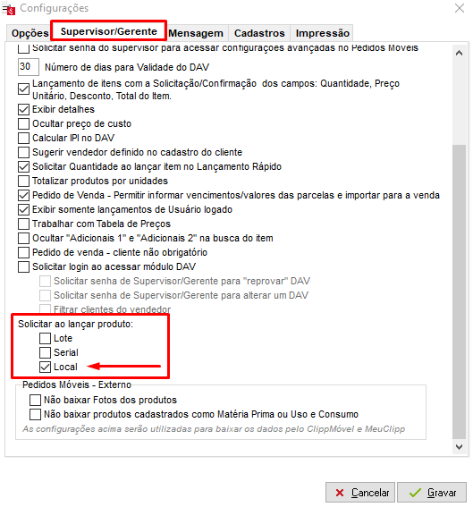 na aba Supervisor/Gerente marque a opção Local;