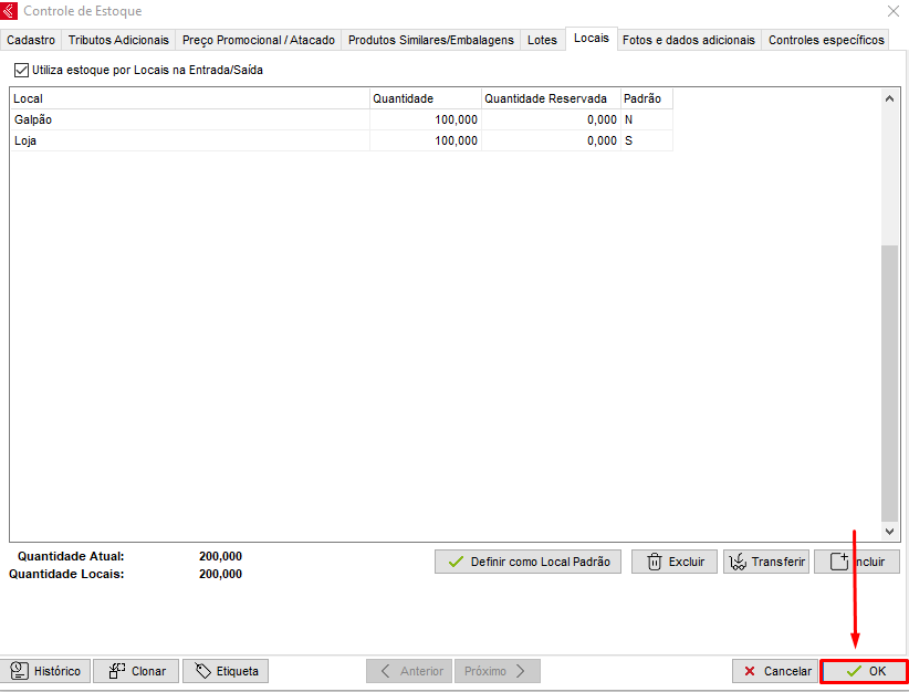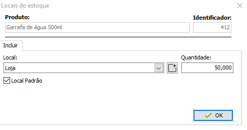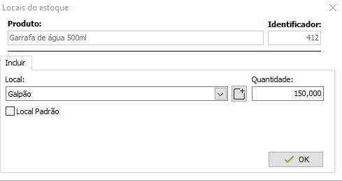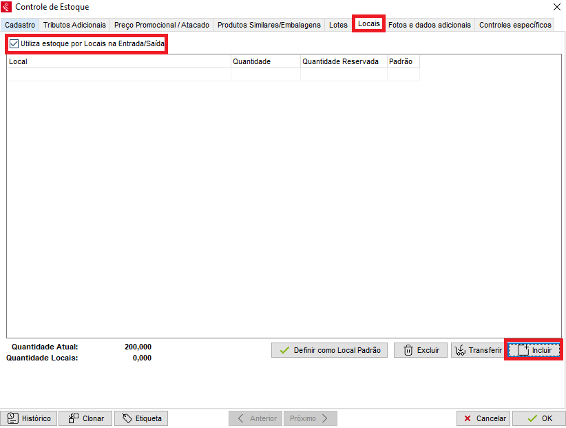 Defina o Local, quantidade existente nesse local e se é o local padrão da mercadoria,