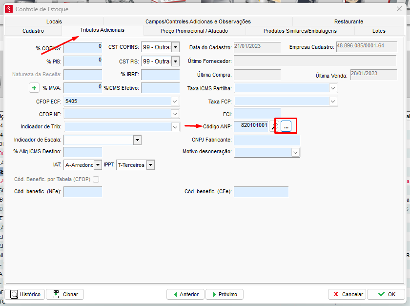 Para informar, abra o cadastro do item que está com o erro, vá até a aba Tributos Adicionais e encontre o campo Código ANP, clique no botão destacado abaixo.